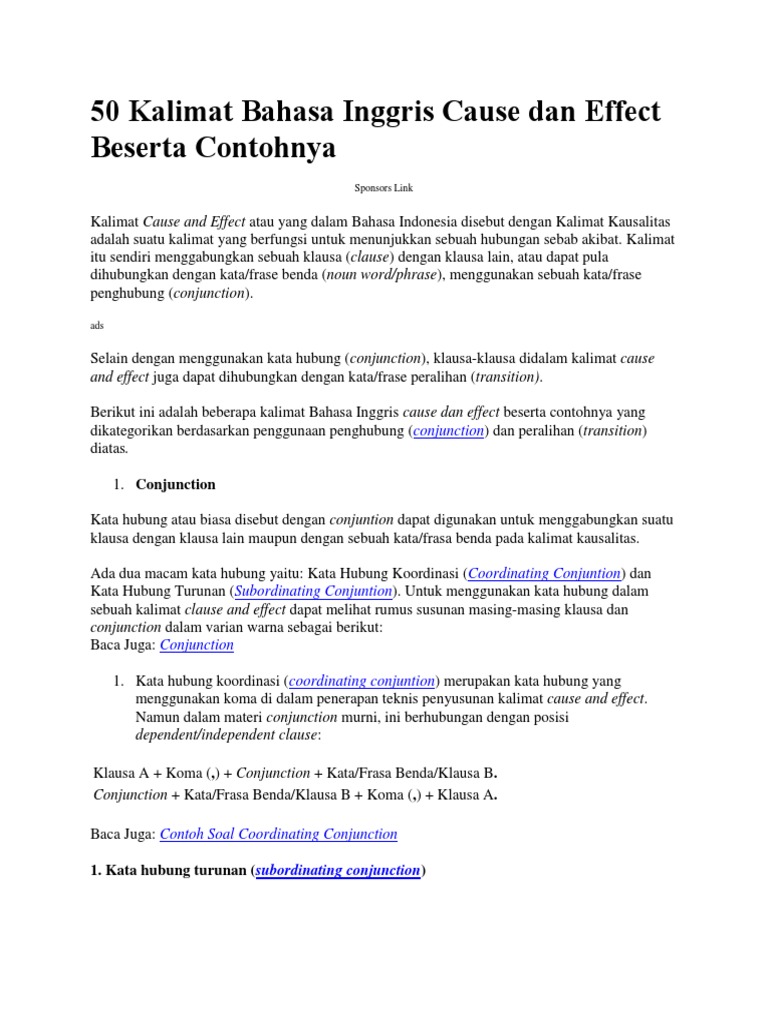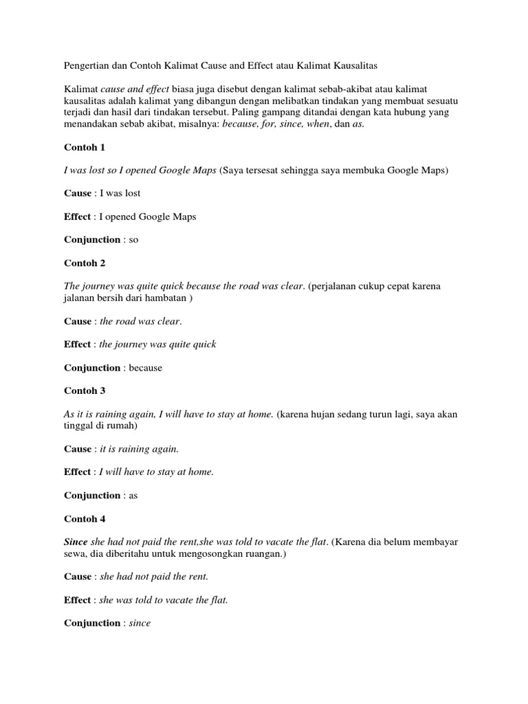 Penggunaan Cause Dan Effect Dalam Bahasa Inggris Halaman All Kompasiana Com from assets-a1.kompasiana.com Kalimat simpleks dan kalimat kompleks. Contoh kalimat tersebut menggunakan unless sebagai hubungan sebab akibat. Baca juga artikel yang mungkin berhubungan : Dalam bahasa inggris, arti dari kalimat cause and effect adalah sebab akibat. Pada kalimat tersebut kita tahu bahwa penyebab tidak lulus adalah jika tidak. Diajar mah tong ngan apal. Rayi bermain basket di lapangan. Untuk menggabungkan antara 2 (dua) kalimat tersebut kita membutuhkan kata penghubung (conjuction) yang berfungsi menjadi penghubung antara sebab dan akibatnya.