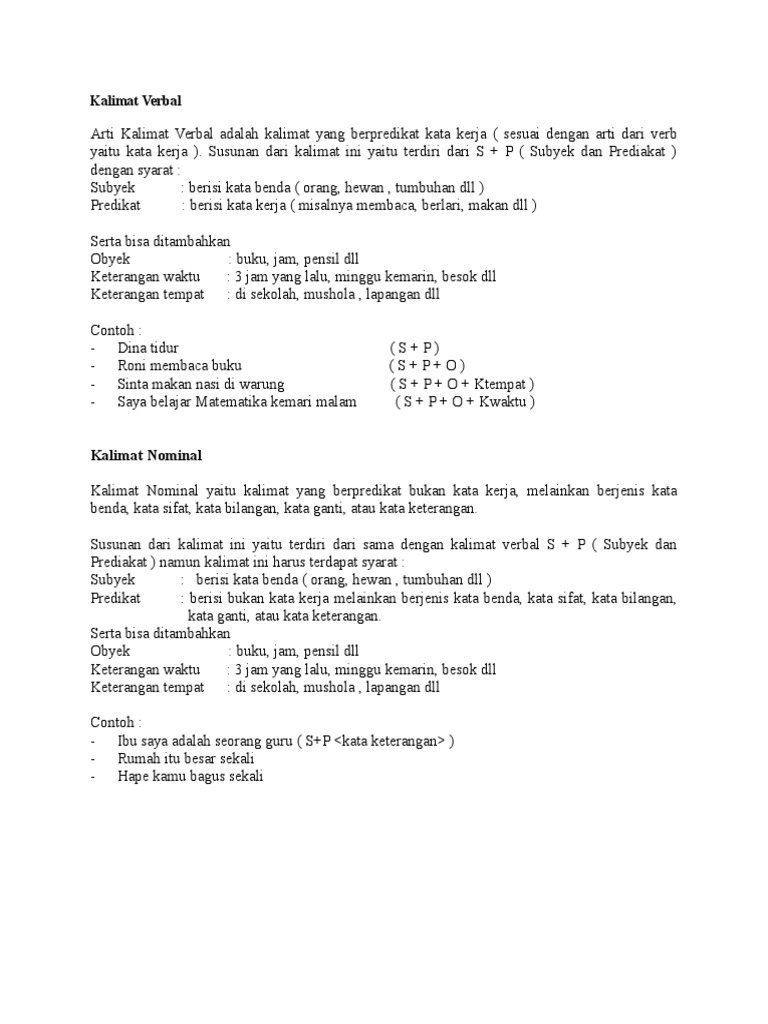 Verba Transitif Pengertian Intransitif Contoh Perbedaan from www.dosenpendidikan.co.id Kalimat verbal adalah kalimat yang mengandung suatu tindakan atau perbuatan. Berdasarkan kata kerja utama suatu kalimat, kalimat dibagi menjadi menjadi kalimat verbal dan kalimat kalimat verbal adalah kalimat yang predikatnya adalah kata kerja. Pengertian kalimat nominal dan verbal dalam bahasa inggris. Gerund phrase, infinitive phrase, dan. Simple past tense dalam bentuk kalimat verbal yaitu suatu kalimat simple past tense yang pada simple past tense (verbal) terdapat 3 bentuk kalimat, yaitu kalimat positif (positive sentence). Dalam kalimat tanya, akan dibentuk dengan menambahkan kata do/does untuk kalimat verbal. Frasa verbal, frasa adjektifa, frasa nominal, dan. Kalimat verbal adalah kalimat yang predikatnya kata kerja.